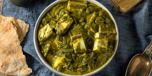Den indiska vegorätten palak paneer med färskost i spenatsås serveras här med ris.