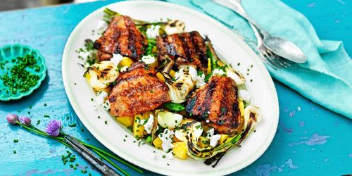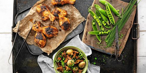 Grillade kycklinglår med en sallad på gulbetor och sockerärtor lämnar ingen besviken.