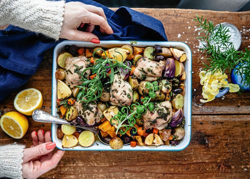Du gör en kylskåpsrensning och kör in allt i ugnen. Ut kommer en tiopoängsmiddag som räddat trötta råvaror. Prova Linnéa Seidel i ett-kyckling.