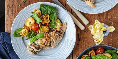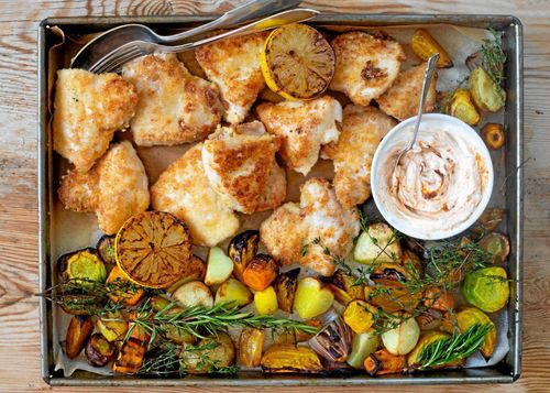 Servera den fasigt ostpanerade kycklingen nystekt med yoghurtsås, ugnsrostade rotsaker och citron att pressa över, tipsar Lands Katarina Ekeström.