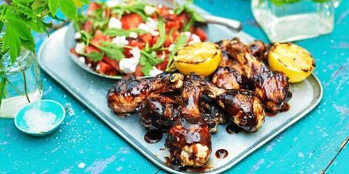 En matig sallad smakar himmelskt gott till marinerade grillade kycklingben.