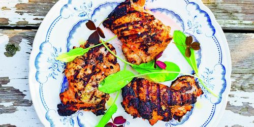Saftiga yoghurtmarinerade kycklinglår med vitlök och spiskummin att slänga på grillen.