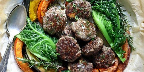 Lammfärsbiffar med ugnsrostad pumpa och savoykål serveras med äppeltzatziki.