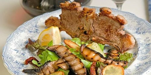 Lammkött och getost är alltid en god kombination. Och till den lite sträva oströran passar sötman från grillade äpplen och sältan från oliver utmärkt.