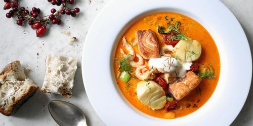 En värmande fisksoppa med saffran, räkor, torskrygg och laxfilé att servera i vintermörkret.