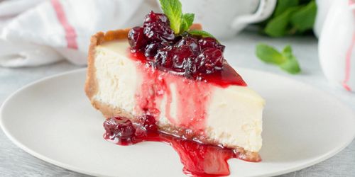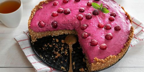 Den klassiska cheesecaken med färskost och digestivebotten får här sällskap av syrligt goda lingon.