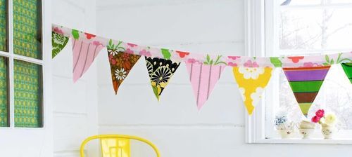 Ett färgglatt flaggspel blir pricken över i när du dukar till fest. Du gör det lätt själv av stuvbitar, tyger från loppis och gamla kläder.