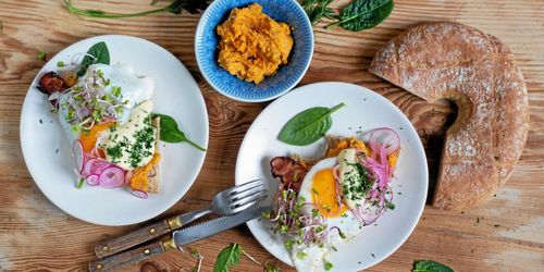 Ägg och bacon blir en hel måltid i sällskap av bröd och morotsröra. Mums!