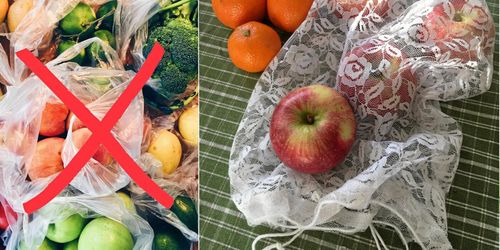Hej då, dumma prasselpåse! Med en hemsydd fruktpåse i spets kan du handla frukt och grönt helt utan plast.