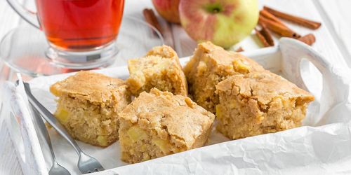 En vit kladdig brownie med en härlig äppelgömma. Baka sensommarens mjuka kaka i långpanna!
