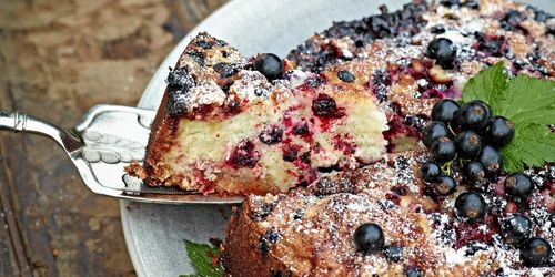 En härligt mjuk och saftig mandelkaka med frisk smak av svarta vinbär. Sensommarens godaste bakverk!