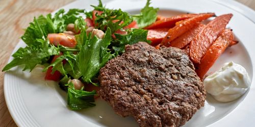 Nötfärsbiffar, sötpotatis och yoghurtsås med vitlök är perfekt snålmat.