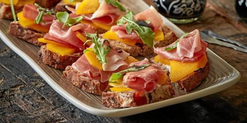 Lyxigt goda små snittar med lufttorkad skinka och saffranskokta päron smakar fantastiskt gott till glöggen.
