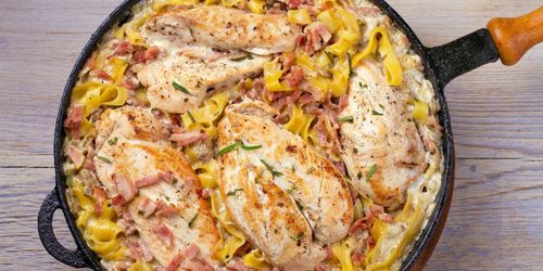Pastapanna med kycklingbröstfilé, bacon och gräddig svampsås.