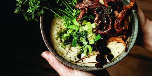 En moderna variant på palt med krispiga chips av rimmat sidfläsk, sauterad svamp och stekt syrligt äpple.