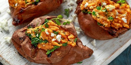 Sötpotatis är ett underbart gott tillbehör som passar till de flesta köttbitar eller fisk. Denna krossade variant är också god som ensamrätt ihop med en sallad!