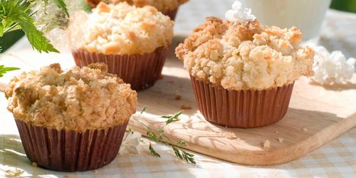Muffins med rabarberkompott och en svag smak av bittermandel är godast allra nygräddade.