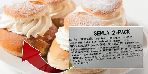 Bakverkets innehållsförteckning är ofta en spännande läsning - kolla noga! Här är semlorna som innehåller både fruktkärnor och palmolja.