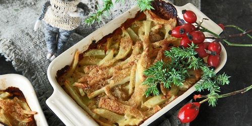 Sältan från matjessill är jättegott i denna variant på Janssons frestelse. Purjolöken ger en mildare smak än den gula löken.
