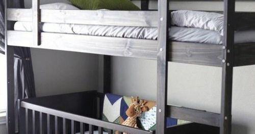 Nu kan vi dela rum för alltid. Våningssängen Mydal har fått nedre sängen utbytt mot en spjälsäng. Bägge sängarna har betsats i samma färg för ett enhetligt intryck.