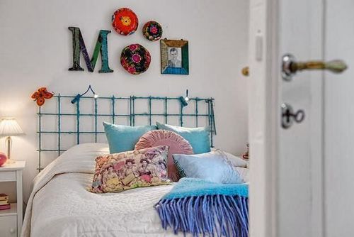 Den här sänggaveln kan du när som helst ge ett nytt utseende. Den rostfria armeringsmattan är lindad med färgglada tygremsor och pyntad med precis vad du vill. Dessutom perfekt att hänga upp läsglasögonen i när du läst klart för kvällen.