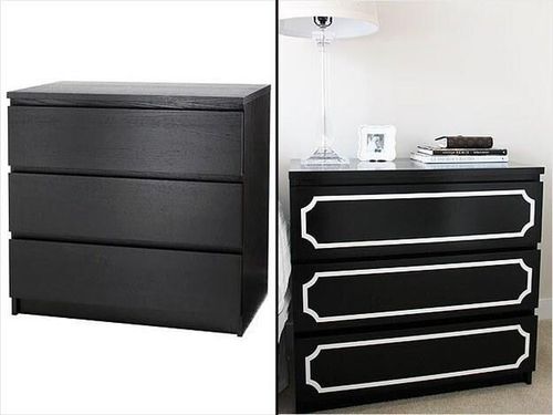 Har du en obehandlad Malm-byrå hemma kan du göra om den på oändligt många sätt. Här har byrån målats svart och vita lister fästs på lådfronterna.