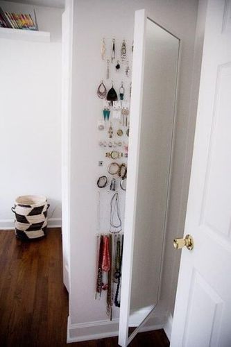 Supersmart att utnyttja utrymmet bakom spegeln Stave. Sätt upp krokar och spikar och häng upp dina finaste smycken.