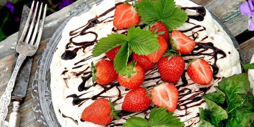 Sommarens absolut enklaste tårta gör du i långpanna. Här är en variant med marängbotten, toppad med marinerade jordgubbar.