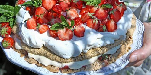 Smarrig och smart tårta med jordgubbar och nötmaräng att sno ihop inför kalaset.