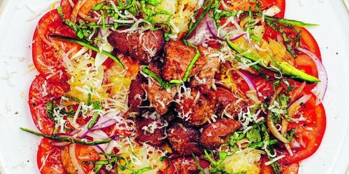 Tomatcarpaccio med filétärningar av älg eller hjort – njut som lyxig lunch eller förrätt.