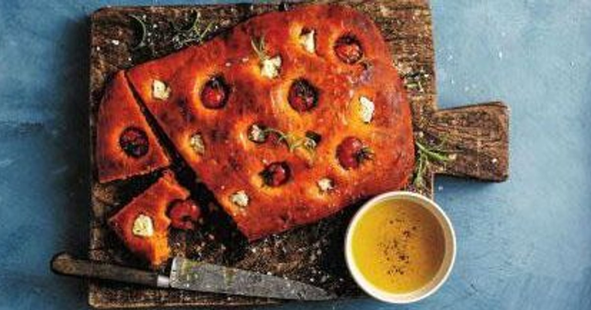 En focaccia bakad i långpanna räcker länge! Skiva gärna upp och stoppa in brödet i frysen. Här är ett recept på en variant fylld med tomater och oliver.