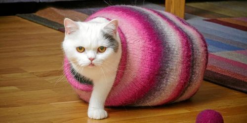 Sticka och tova litet bo till liten katt. Inte roligt nog? Som bonus slänger vi med en liten boll att leka med.