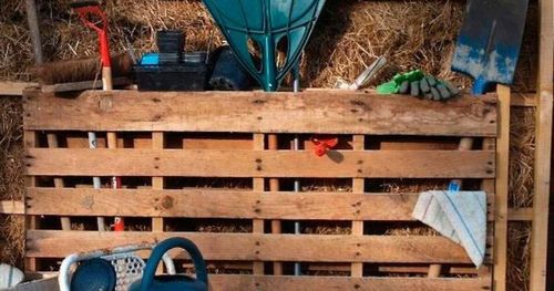 Nu är det slut på röran. Ställ upp en lastpall mot garageväggen och trä ner verktygen i mellanrummen. Både snyggt och praktiskt!