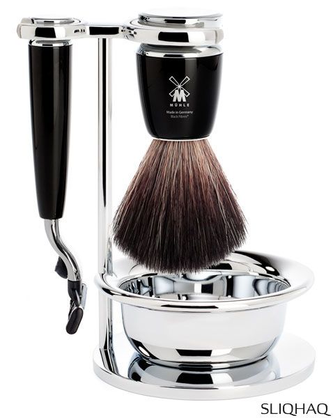 Ett kit med matchande svart rakhyvel och rakborste från Mühle. Borsten och hyveln hänger i ett rakställ och du får även en snygg rakskål i rostfritt stål för att vispa upp tjockt och fint raklödder i.