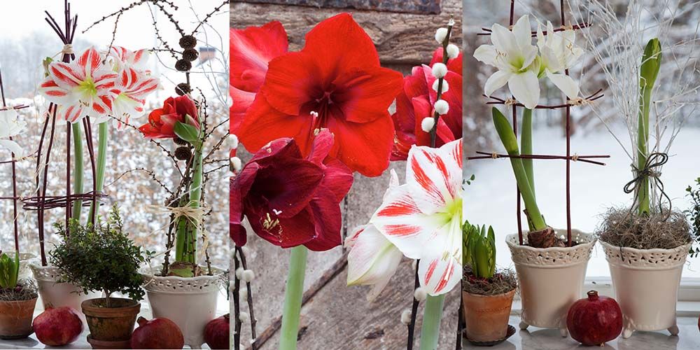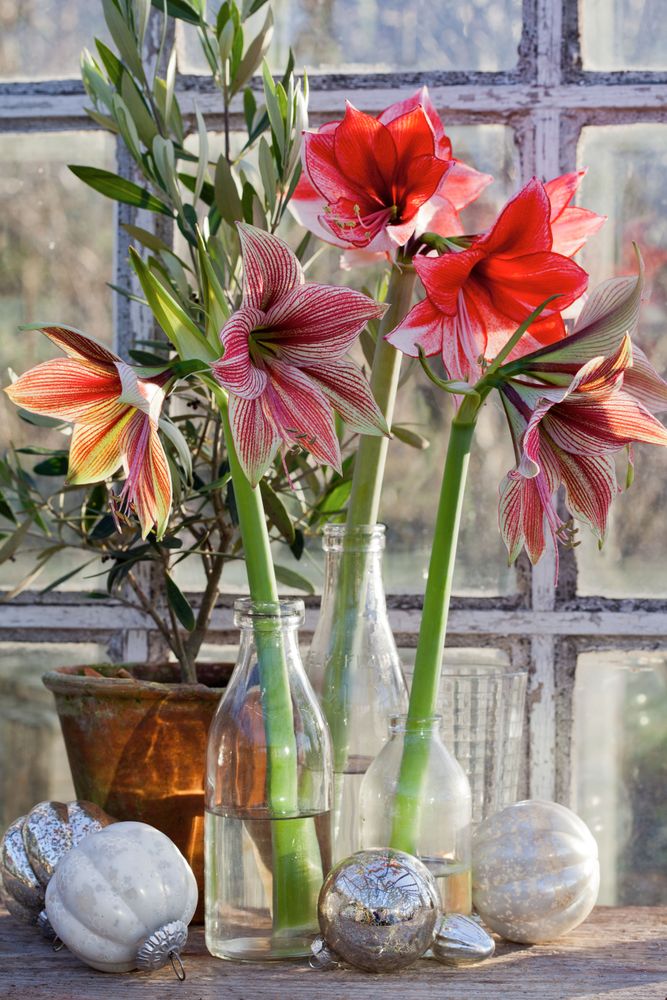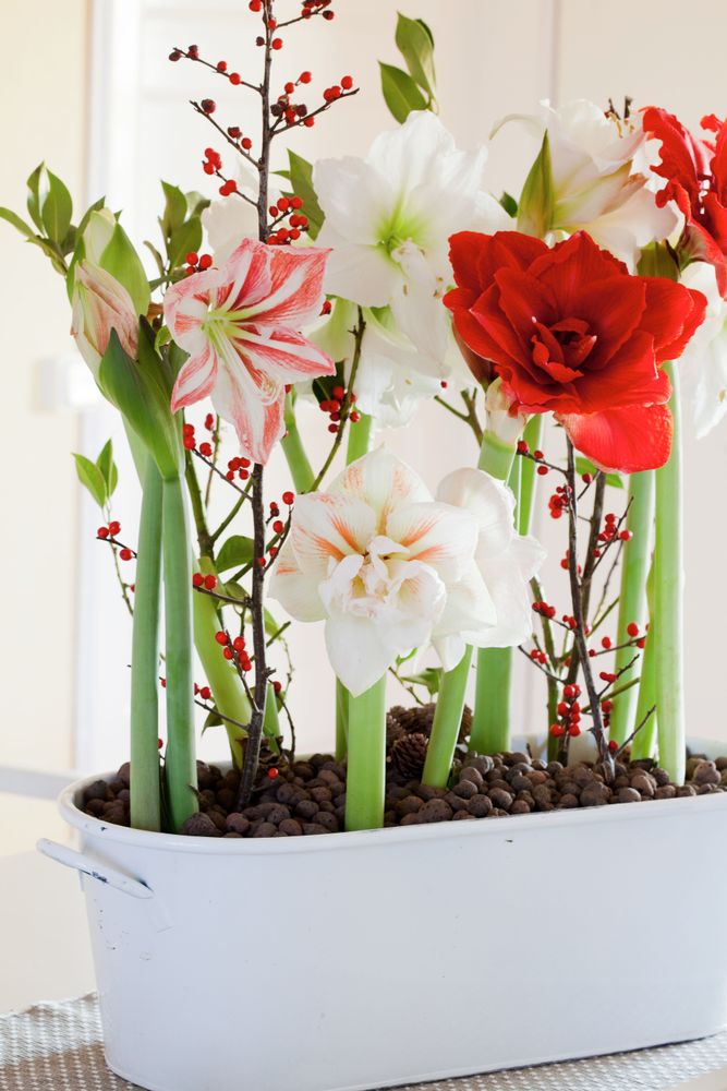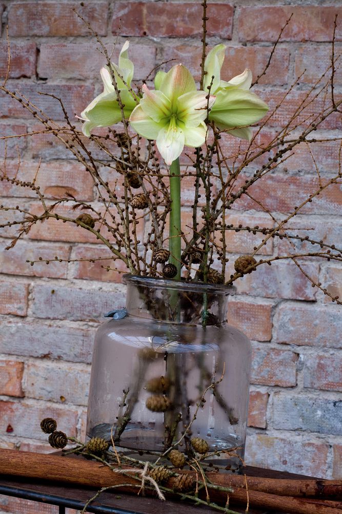 Vita amaryllissorten ’Intokasie’ stöds av en stege medan randiga ’Sidney’ omges av en liten växtkon, båda gjorda av röda kornellkvistar. Röda ’Souvereign’ och den outslagna amaryllisen har fått stöd av lärkkvistar respektive vitsprejat björkris som stuckits ner runt lökarna och bundits ihop kring amaryllisens stjälk. Det lilla krukträdet är en myrsine.