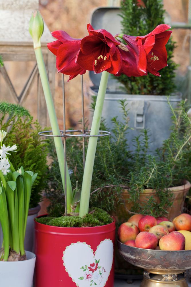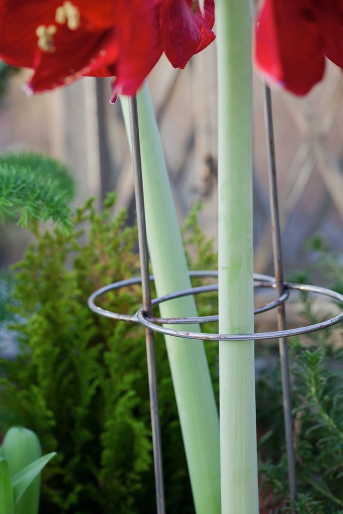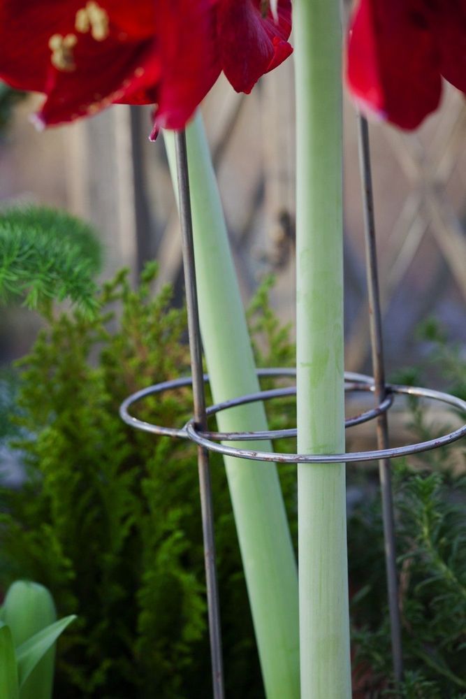 Den ståtliga amaryllisen har egentligen bara en svaghet; den långa stjälken kan vika sig och gå av. Räddningen är att göra fina stöd av pil eller andra kvistar som sticks ner i krukorna och binds ihop på olika sätt. Kvistarna kan också användas som blompinnar och stickas ner i jorden intill löken.