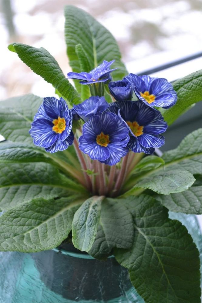 En blå zebra. ’Delft/Zebra Blue’ ser ut som en korsninge mellan en blåsippa och en zebra. Blommorna sitter på korta stjälkar i mitten av plantan, omgivna av en bladrosett med avlånga, krusiga blad.