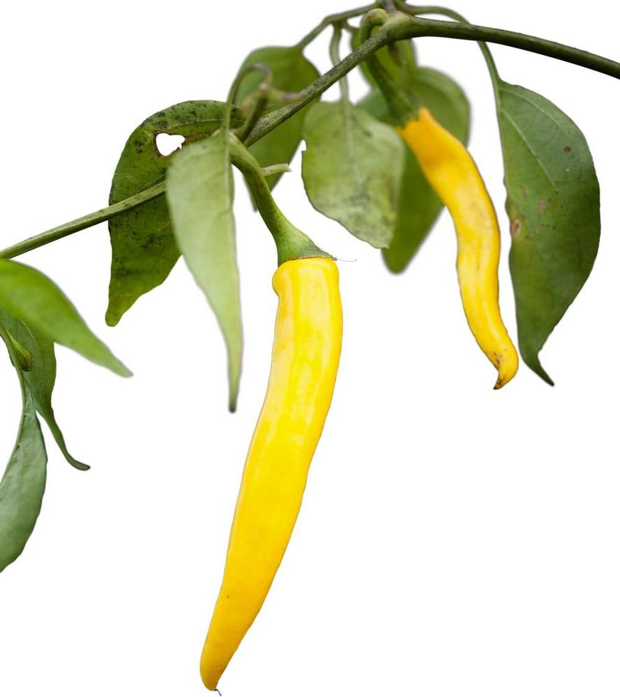 ’Golden cayenne’. En tidig produktiv sort med långsmala nästan vaxartade frukter med tunt fruktkött. Frukten mognar vackert från grönt till gyllengult på den knappt meterhöga buskiga plantan. Lättodlad nybörjarchili med brett användningsområde.