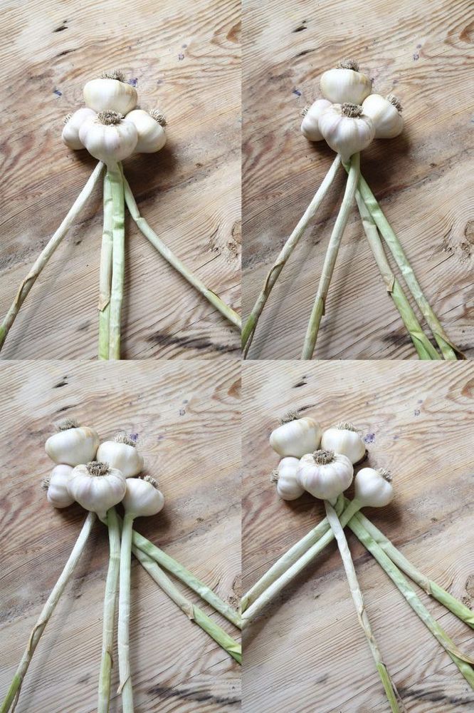 Sen är det bara att köra på. Lägg en ny vitlök i mitten med stjälken i mitten. Lägg över de vänstra stjälkarna till höger.