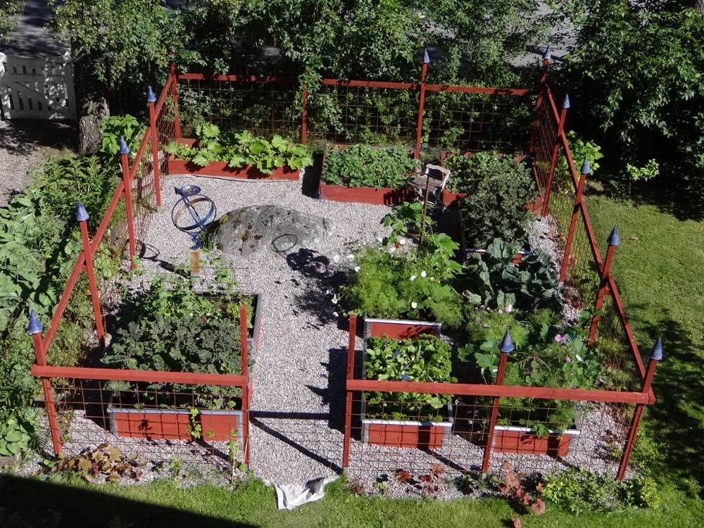 Runt alla odlingslådorna täckte de marken med en fiberduk från bygghandeln och över det fyllde de på med grus. De har även fäst en snigelkant runt odlingslådorna.