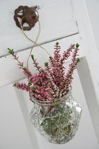 Häng en fin liten glasvas i ståltråd och stoppa ner en skir ljungkvist.
