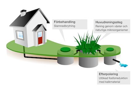 Ett biologiskt reningsverk består av tre steg. Först bryts avloppsslammet ner i syrefri miljö (vilket gör att man slipper slamtömning). Därefter renas vattnet i syresatt miljö med hjälp av vattenväxter och mikroorganismer i biologiska processer. Slutligen tas fosforn om hand med hjälp av ett naturligt kalkmaterial, en så kallad fosforfälla.