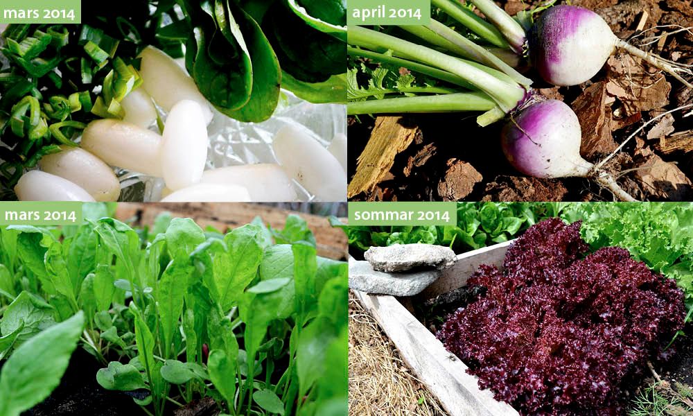 Med en varmbänk i trädgården låter jag vårens skördar avlösa varandra på ett bra sätt. Varmbänken börjar ge skörd redan i mars. Sedan ger kallbänkarna skörd från april, innan de första bladgrönsakerna kan tas från odlingen på friland i maj. Om våren är fin vill säga. På så sätt kan vi vara självförsörjande med en del grönsaker redan från tidig vår.