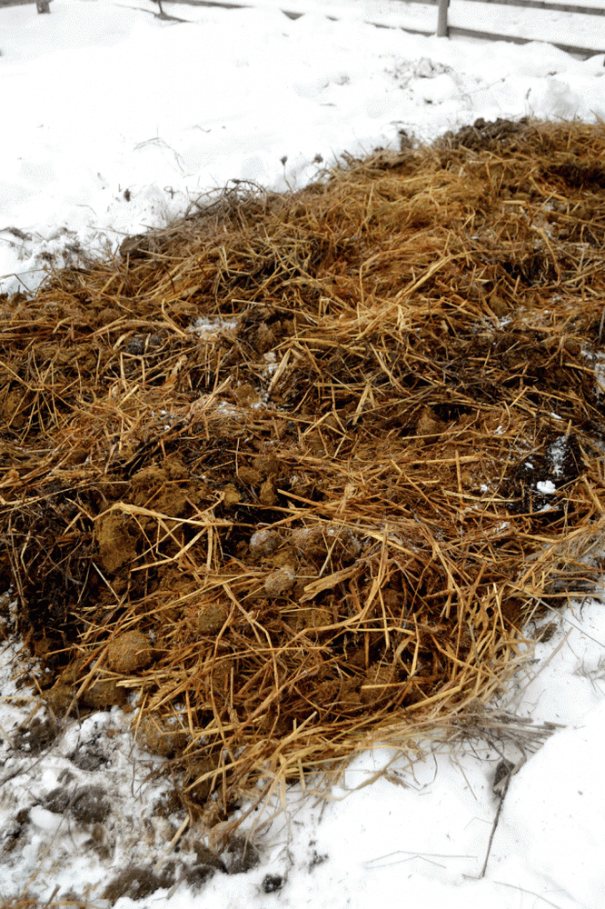 Min bädd slukar fyrtiosextio säckar, beroende på hur hög jag gör den. Ju högre bädd, desto mer värme avger den och under längre tid. I boken Hot Beds av Jack First har jag läst att gödseln inte ska vara äldre än åtta veckor då den används i varmbänken, det gäller alltså att hämta färsk skit. Den får inte ha börjat alstra värme (det kallas för att gödseln brinner) då varmbänken läggs, det är ett av misstagen jag gjort tidigare. Materialet hade svalnat då jag flyttade högarna och sedan kom värmen inte i gång igen.