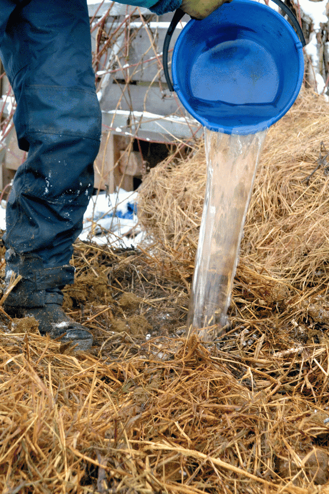 En stor del av förberedelserna handlar om att hämta gödsel. Jag är noga med att använda gödsel som är blandad med halm eftersom det är halmen som alstrar värme då den bryts ner. Då jag inte har egna hästar hämtar jag skit hos en hästägare i närheten. Solveig mockar i stora byggsäckar till mig, prima hästskit blandat med halm. Det ger fin värme.