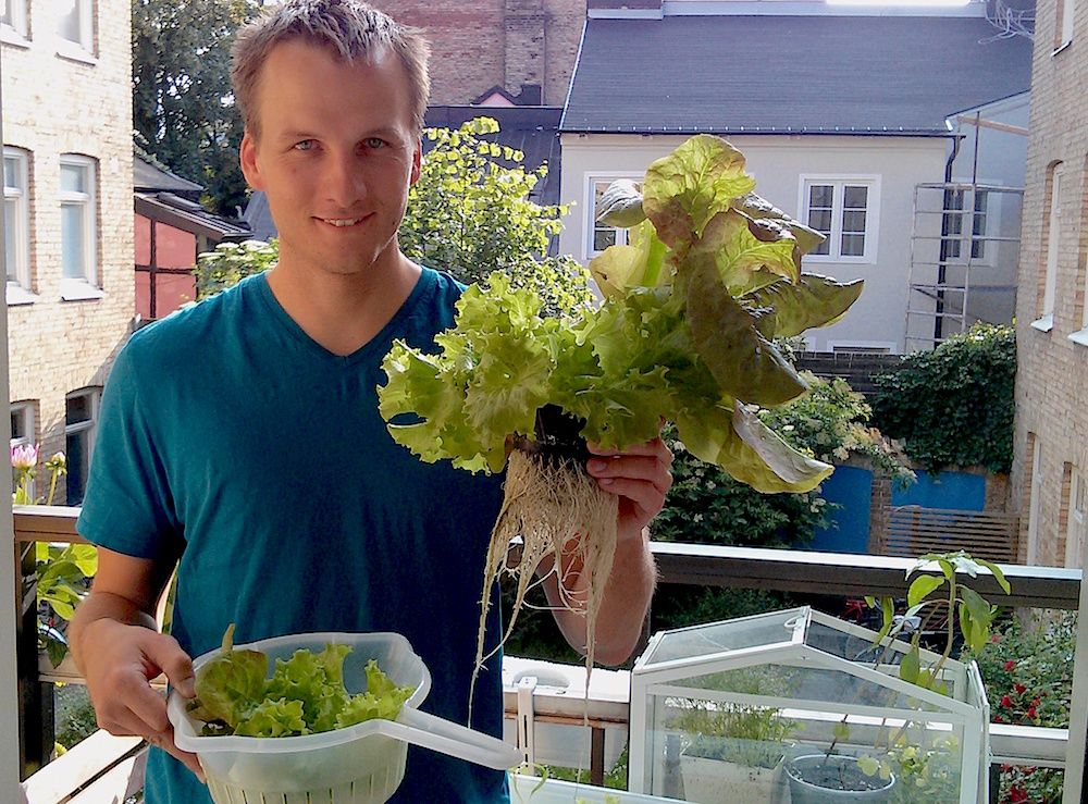 Niklas Hjelm och hans sambo bor i en tvårummare i centrala Malmö. Det hindrar dem inte från att vara nästan självförsörjande på grönsaker – året om. Sallad, spenat, kål, och allehanda kryddor skördar de dagligen till sallad och matlagning.