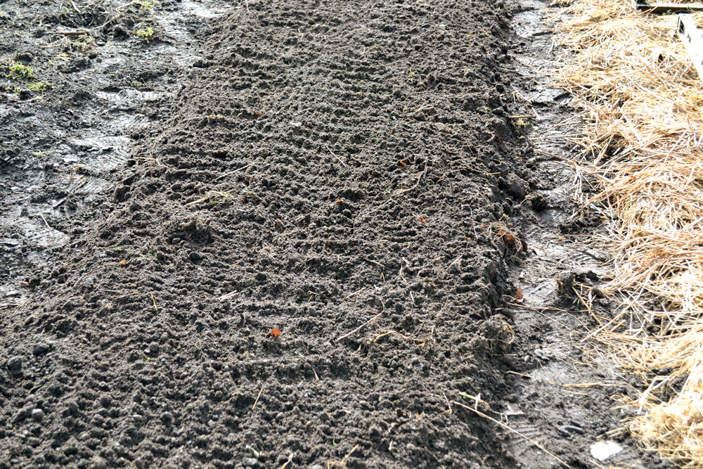 Att jorden kan krattas utan att det bildas stora blöta klumpar tar jag som ett tecken på att det är dags att så. Flera av de tidiga grönsakerna tar inte så stor plats, därför väljer jag att dra upp rader i landet med knappt 20 centimeter emellan. Ganska tätt alltså. Jag har sällan tid att dutta med linor och grejer för att få raka rader utan höftar genom att ställa krattan på högkant och dra mina fåror. Och vem skulle få för sig att kolla om raderna är raka?