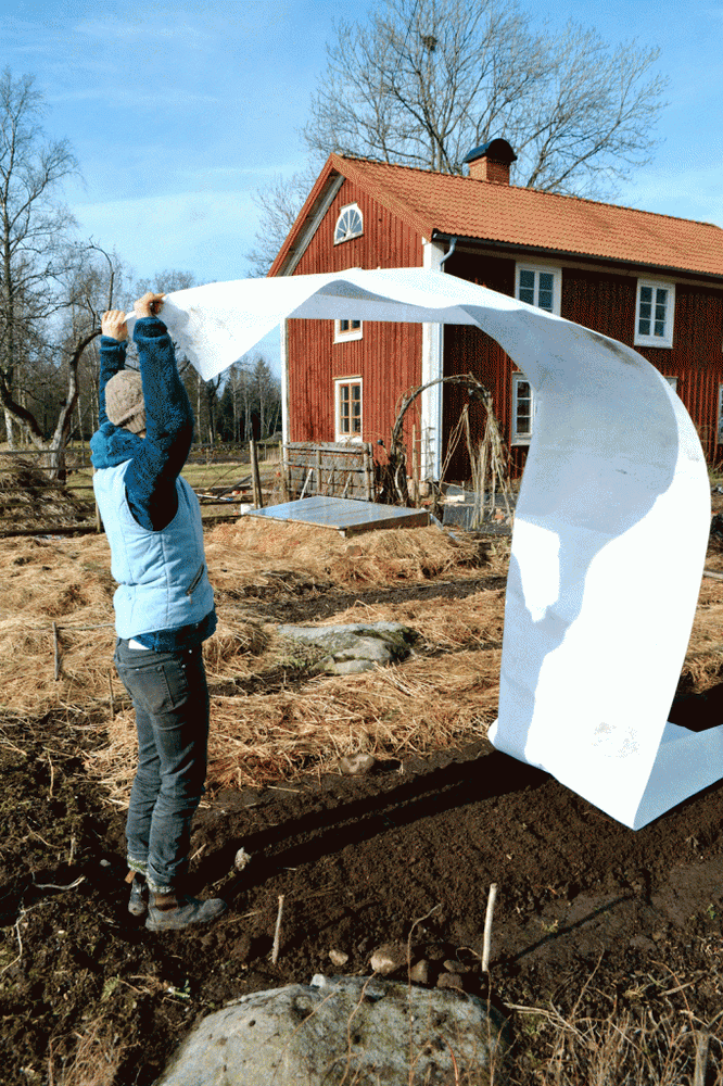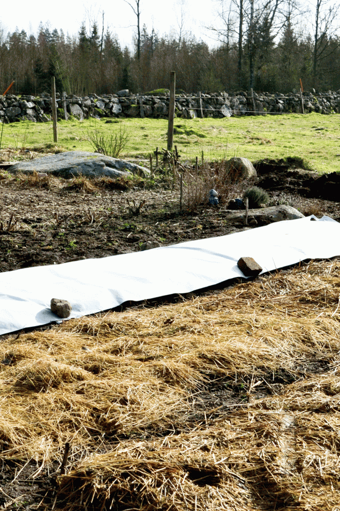 6. Fiberduken förankras genom att stenar läggs på sidorna. Övriga bäddar är täckta med halm i väntan på sådd.