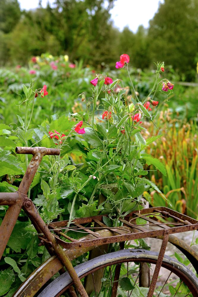 Växtstöd, små staket, portaler och odlingshögar har jag gjort av kvistar och grenar. En del odlingslådor och inramningar till bäddar är tillverkade av ytved jag fått från ett sågverk i närheten. Och staketet av rostiga cyklar hjälper till att skapa ett vindskyddat läge för grönsakskvarteret bakom.