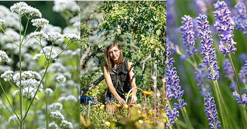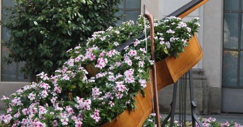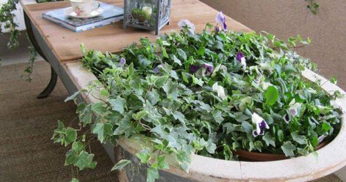 Det vackra gamla zinkbadkaret läcker som ett såll men det gör ingenting. Här har det fått en dubbel roll på uteplatsen, det är bord och plantering på en gång.I ena änden har en bordsskiva lagts över badkarskanterna, i andra står stora krukor fulla med blommor. Basen är några frodiga plantor murgröna, mellan dem sticker fina penséer upp.